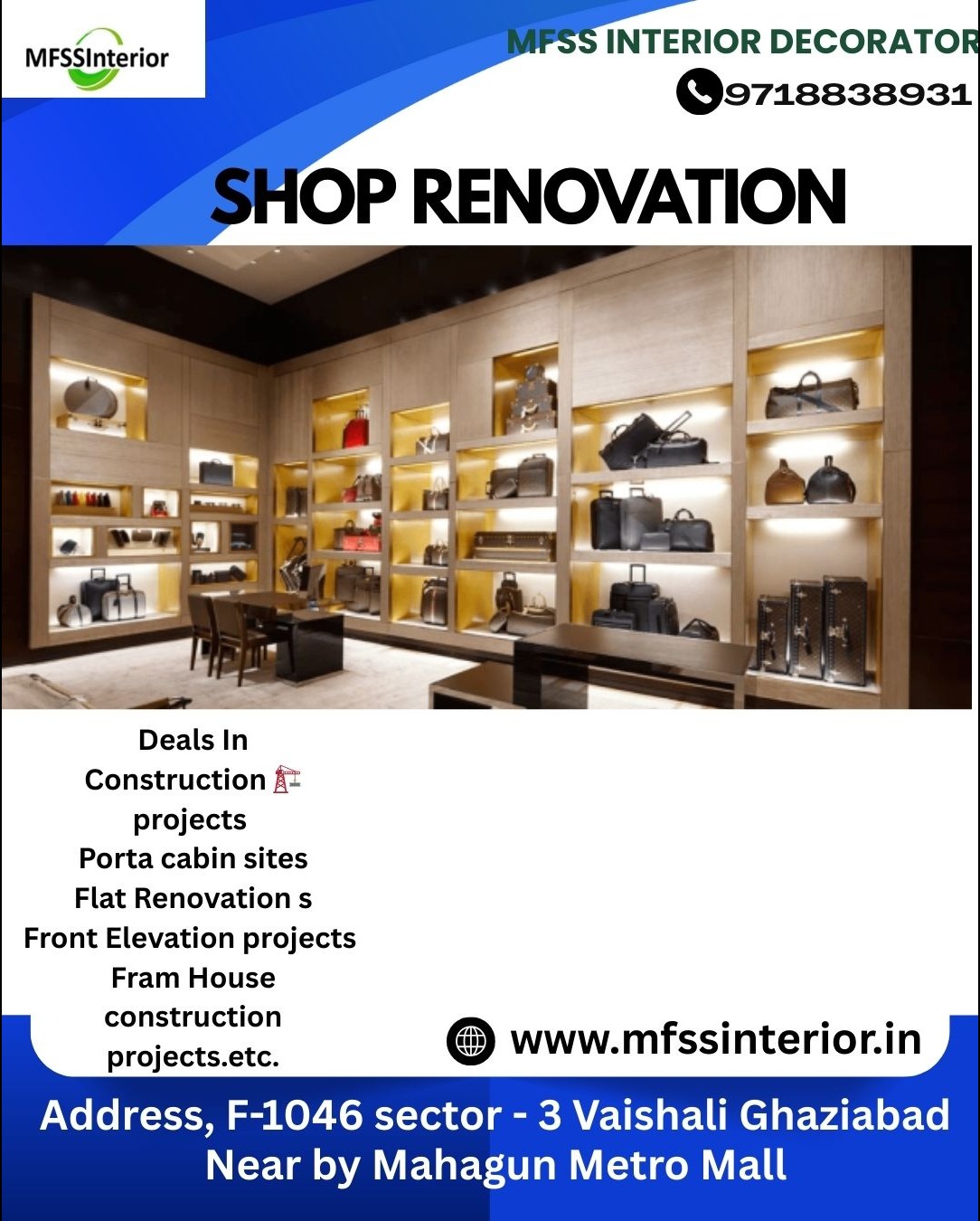 Shop renovation means upgrading or redesigning a retail/commercial space to make it more attractive, functional, and suitable for business needs. A good renovation can increase customer footfall, improve product display, and create a modern brand image. 🔹 Steps in Shop Renovation Planning & Design Define purpose: retail, boutique, café, electronics, etc. Layout design: entrance, display area, billing counter, storage Branding: colors, lighting, signage aligned with your brand Civil Work Demolition of old partitions/fixtures Flooring change (tiles, wood, vinyl, stone) Wall plastering, false ceilings, partitions Electrical & Lighting Concealed wiring, sockets, and switches Accent lighting for products (spotlights, LED strips) Energy-efficient fixtures Carpentry & Fixtures Display racks, shelves, counters Modular storage & cabinets Custom furniture for your product type Finishing & Interiors Painting or wallpaper (can use imported wallpaper for premium look) Glass partitions, mirrors for depth Branding signage, logo panels Final Touches Air-conditioning / ventilation Security (CCTV, shutters, alarms) Decorative elements (plants, art, décor) 🔹 Design Ideas by Shop Type Clothing Store → Bright lighting, large mirrors, mannequins, open racks Jewelry Shop → Elegant counters, secure glass displays, warm lighting Electronics Store → Minimal shelves, interactive displays, charging stations Café / Food Outlet → Cozy seating, vibrant colors, themed décor General Retail → Flexible shelving, wide aisles, customer flow planning